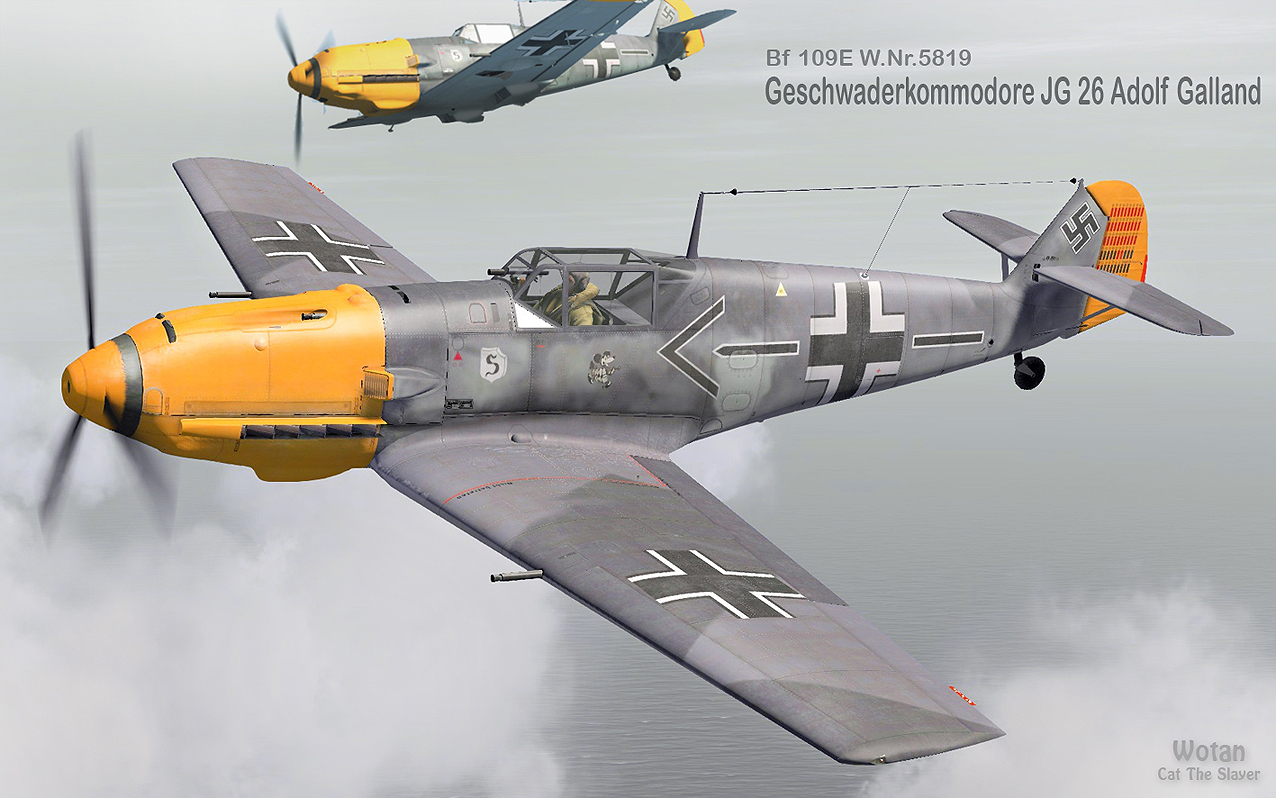 Bf109E-7/Z W.Nr5819 Major Adolf Galland. Машина на которой Галланд летал с осени 1940г вплоть до апреля 1941 года. Во время его отпуска, в начале 1941 года машина (изначально E-4/N) прошла модернизацию- получила возможность подвески доп. бака (Е-7), и систему GM-1. В конце апреля 1941 года машина была передана в "учебно-боевую" Erg.Gr. JG26